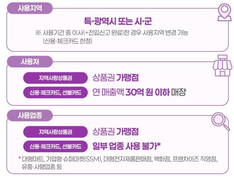 신용*체크카드,선불카드는 대형마트나 기업형 슈퍼마켓,백화점, 프랜차이즈 직영점, 유흥*사행업종 등은 사용이 불가한 점 참고하시기 바랍니다.